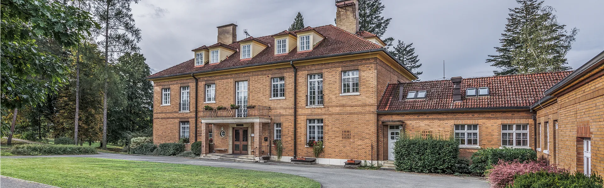 Domek zahradníka je zajímavý z několika hledisek – jde o prostý hranol z režného zdiva vychází z konceptu baťovských minimálních rodinných domků, ale odlišuje se stanovou střechou i svou střídmě klasickou formou.